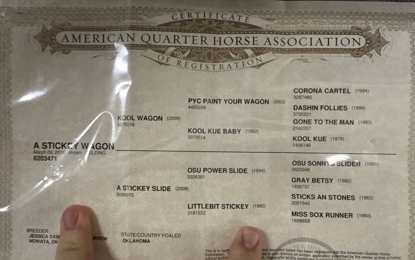 “Stickey” is a 2018 AQHA gelding with a pedigree stacked with proven sprint speed and legit performance horse blood. His sire, Kool Wagon, is a son of the one and only PYC Paint Your Wagon (LTE $889,581), who’s by Corona Cartel, one of the top race sires in the world. On the bottom side, his dam is by OSU Power Slide, an AQHA Performance Champion and multiple Congress and World Show placer in heading, heeling, and tie-down roping.