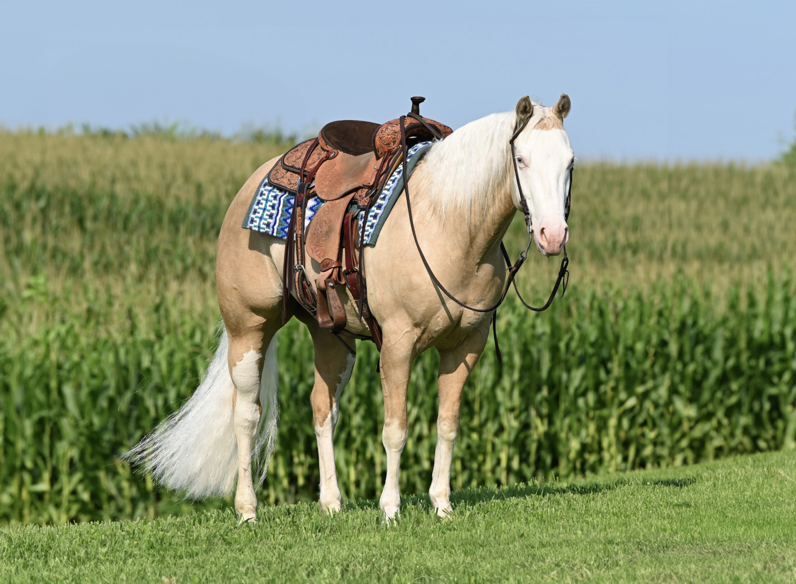 This gelding is the complete package: a big, bald-faced palomino with all the chrome, super flashy, and 100% natural hairโno fake tail here. Heโs the one that gets noticed everywhere you take him.