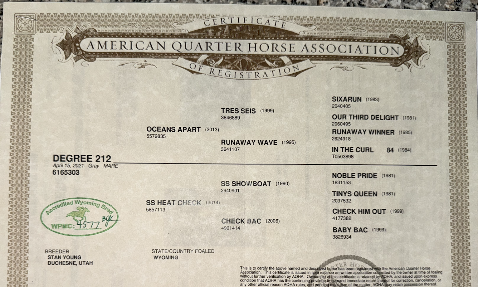 2021 AQHA dappled gray mare by Oceans Apart a son of the great Tres Seis (LTE 856k+). This mare is out a daughter of SS Showboat, who was AAA on the track and has lifetime earnings of $81k+.