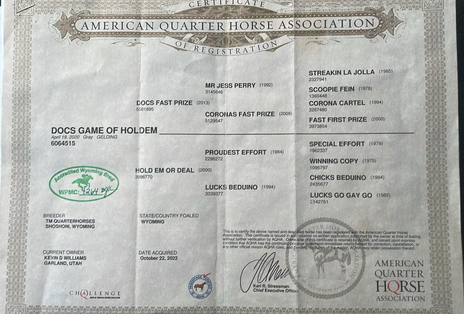 He is by Docs Fast Prize, an earning son of Mr Jess Perry who was out of a Corona Cartel mare, and out of Hold Em Or Deal Em, an own daughter of Proudest Effort (by Special Effort) who was an earner on the track herself. This is a pedigree stacked with proven race blood on both sides, known for producing speed, athleticism, and horses that can go on and do something after the track.