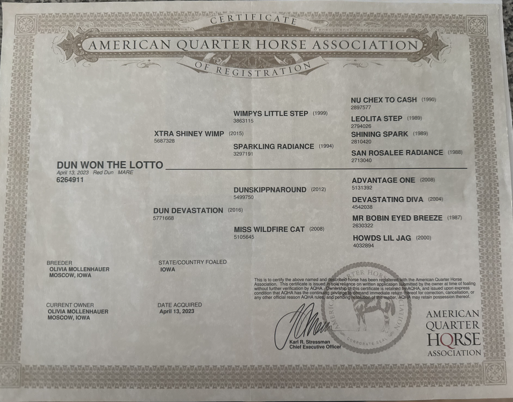 “Lottie”” is a GORGEOUS 3 year old AQHA red dun mare by Xtra Shiney Wimp, by the famous Wimpys Little Step. She is out of a foundation mare by DunSkippinAround. This is a pedigree that blends proven reining blood with practical, usable ranch influence. This mare has a huge hip, a great shoulder, and a mane that drops past it.