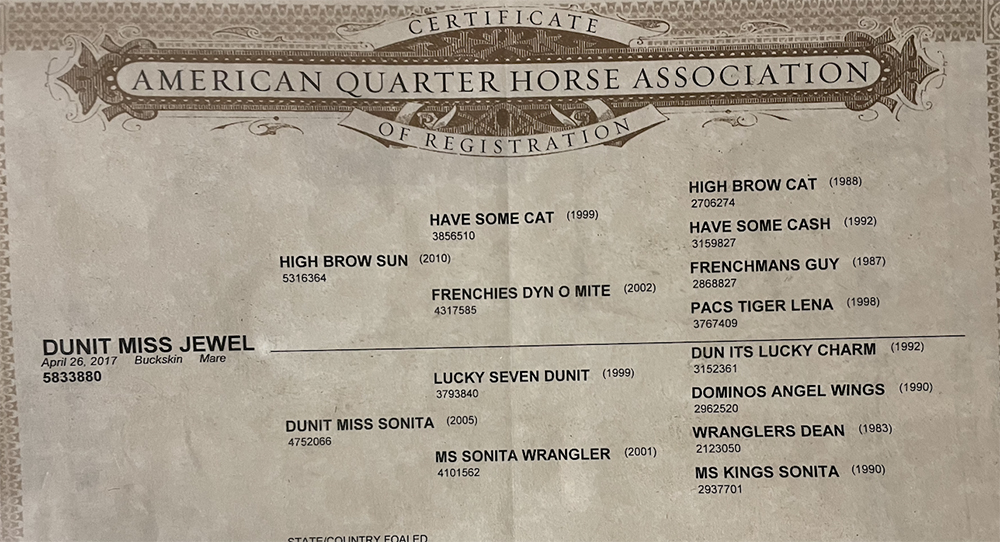 4 year old AQHA mare who is by a son of Have Some Cat (High Brow Cat – NCHA $126k+ x Miss N Cash – LTE $124k+) who was crossed on a daughter of Frenchmans Guy! (sire of $14 million+)