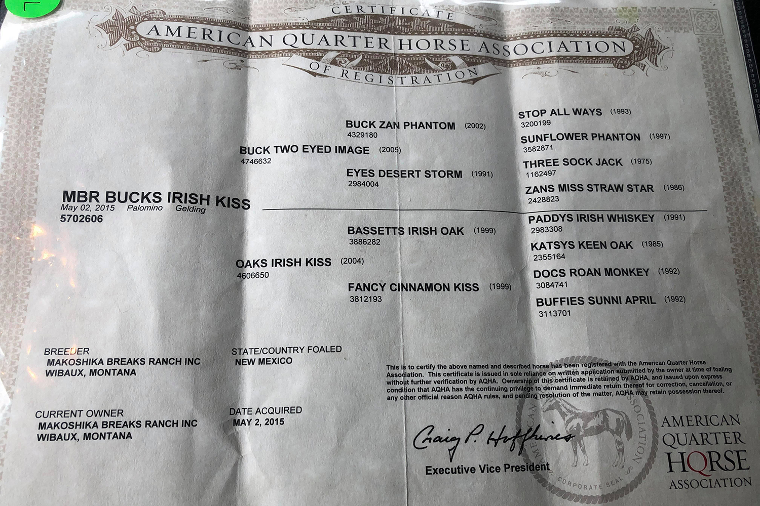 His dam is an own daughter of Bassetts Irish Oak by Paddys Irish Whiskey (NRCHA All-Time Leading Sire, $1 million+ producer)