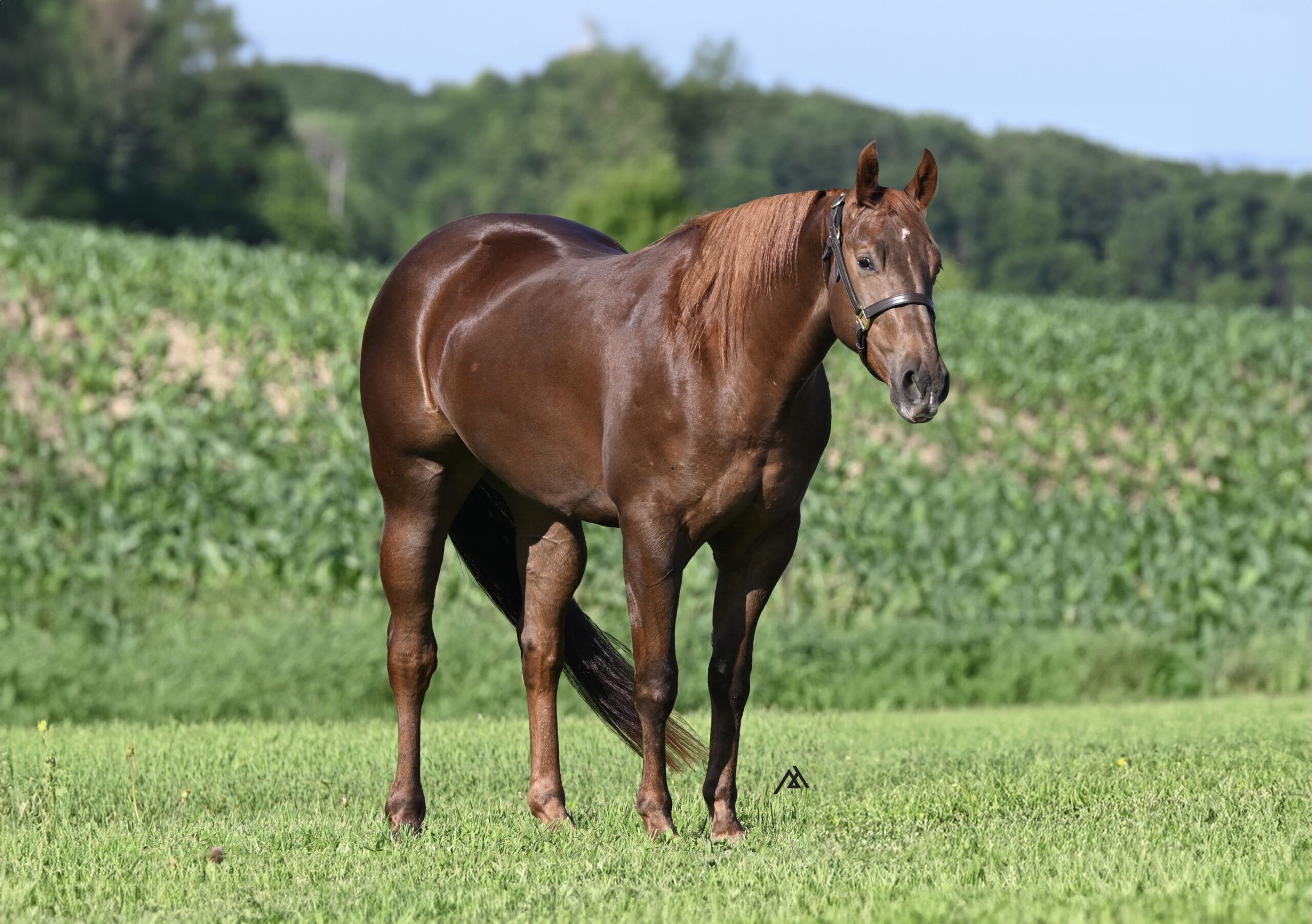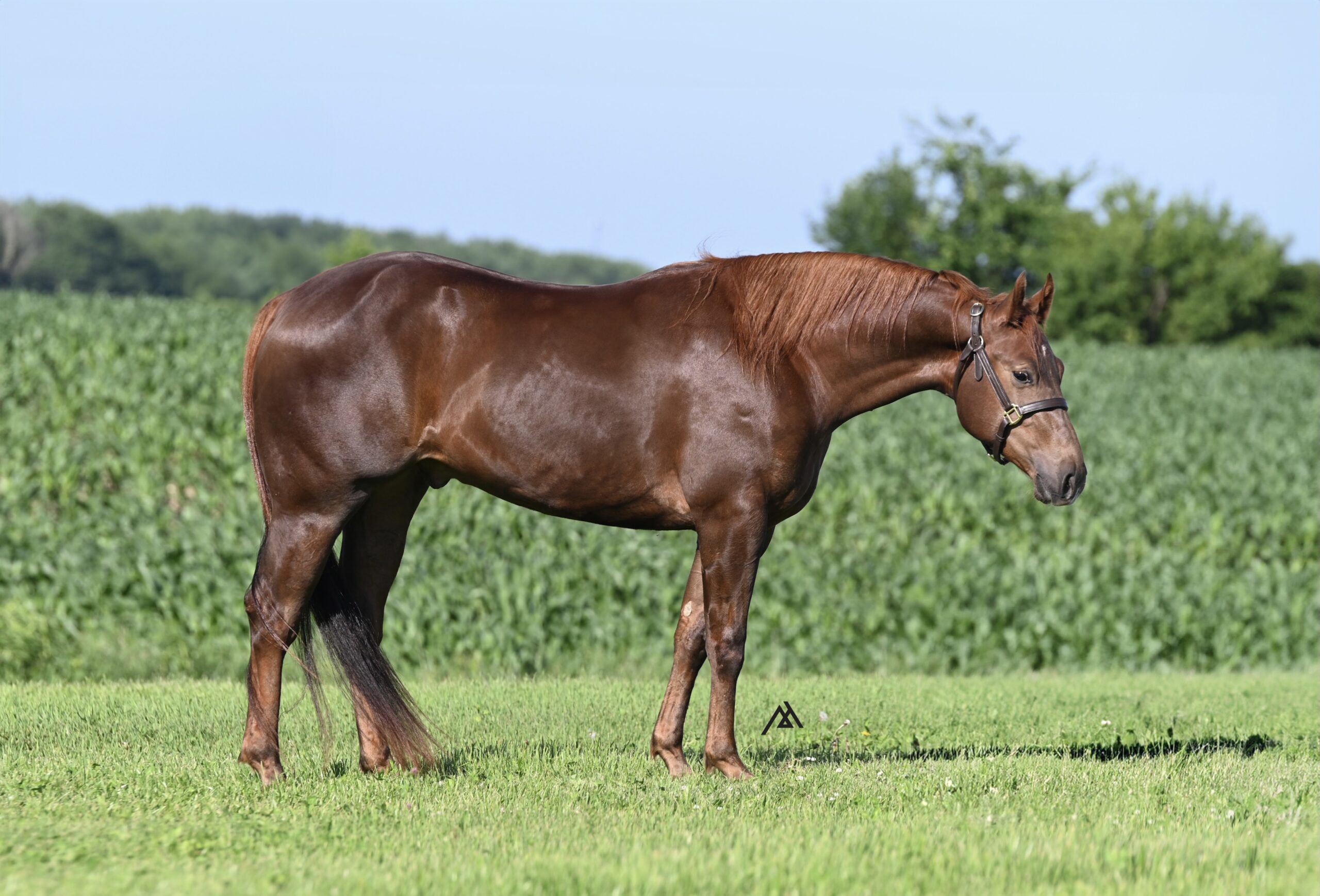 “Squirrel” is 3 years old and one of the most naturally balanced, willing, and people-oriented youngsters we’ve ever had. I told a guy today he is the kind you walk by in the stall barn, peak behind he bars, and say “what’s he? That’s a really nice looking animal” and his nose is out the feed hole for a pet before you even finish speaking. He has tail for DAYS, so much shape, and is shinier than a brand new penny.