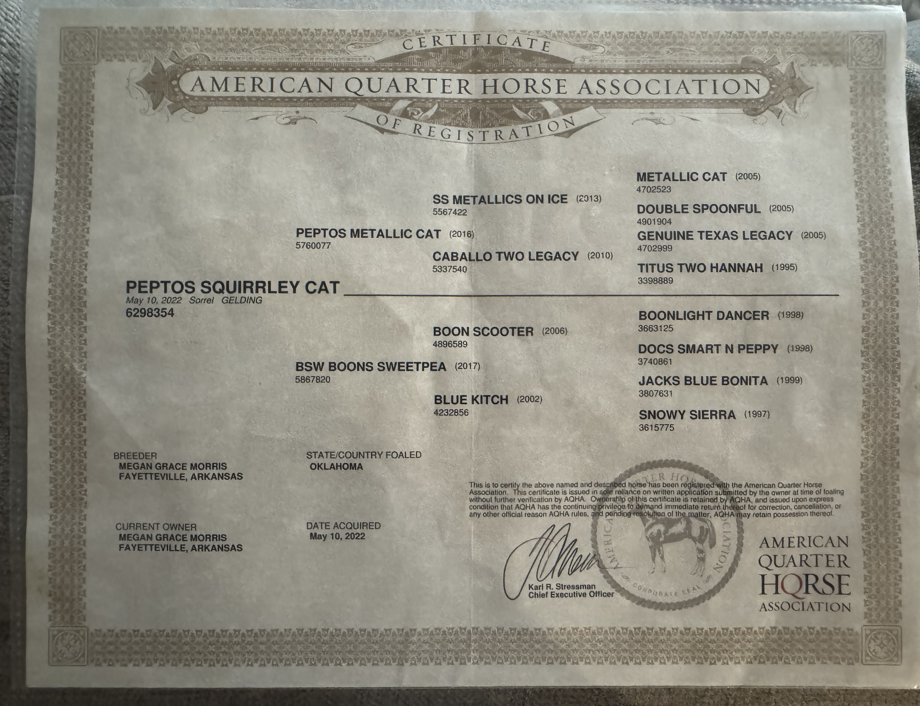 2022 AQHA gelding by Peptos Metallic Cat (SS Metallics on Ice by Metallic Cat), out of BSW Boons Sweetpea by Boon Scooter. This guy is loaded with proven cow horse blood—Metallic Cat, Double Spoonful, Boonlight Dancer, Docs Smart N Peppy—just to name a few. If you’re a pedigree person, you’ll appreciate what he brings to the table before you even swing a leg over. But if papers don’t impress you? Keep reading—because this gelding will.