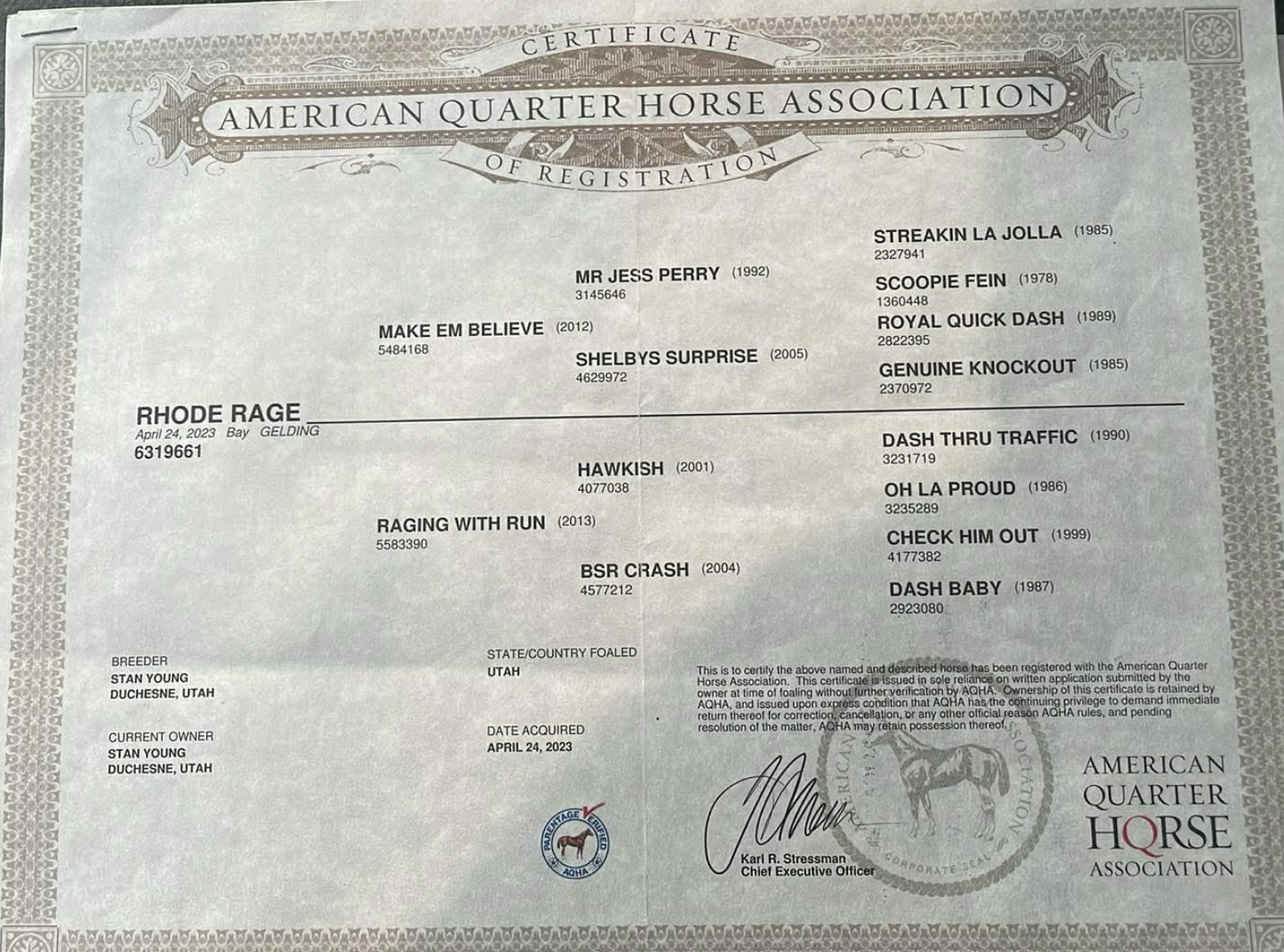 Rhode Rage is a 3 year old AQHA bay gelding son of Make Em Believe (si 98), a son of the legendary Mr Jess Perry, and out of Raging With Run, an earning daughter of Hawkish (LTE $685k+).