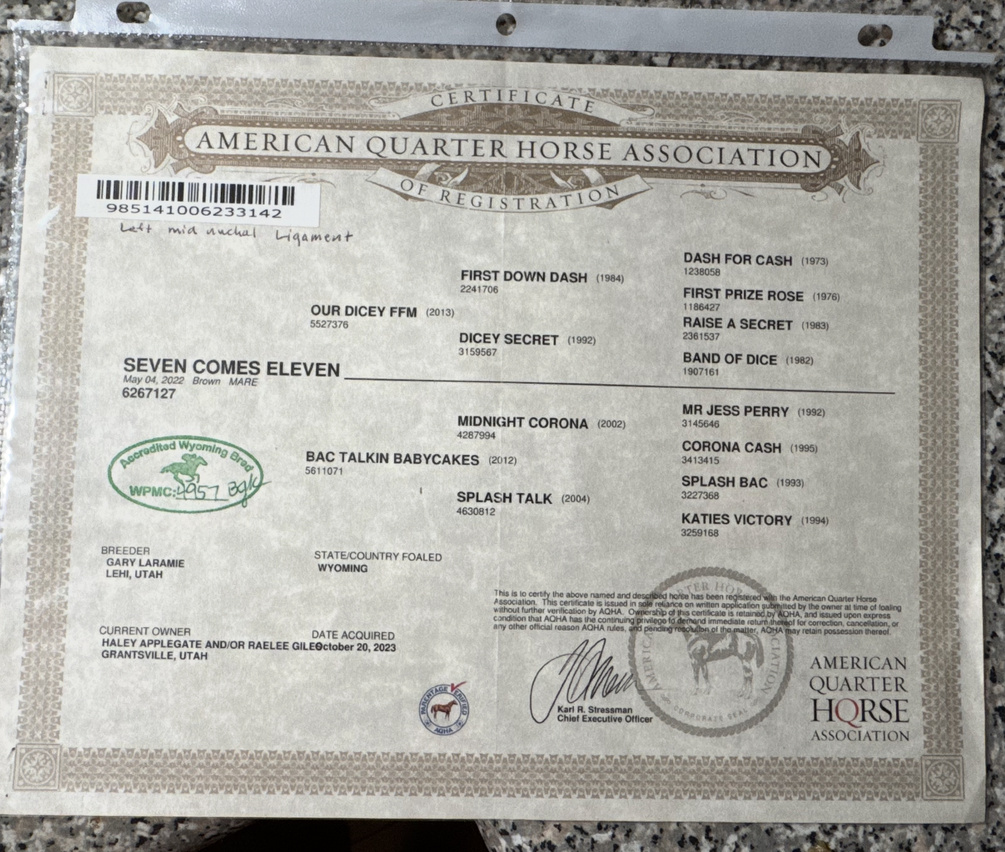 Seven Comes Eleven is a 2022 AQHA bay mare sired by a race-earning son of the legendary First Down Dash, the all-time leading sire of money earners and one of the most influential names the track has ever produced. Her dam, BAC Talkin Babycakes, is a race earning daughter of Midnight Corona (by Mr Jess Perry).