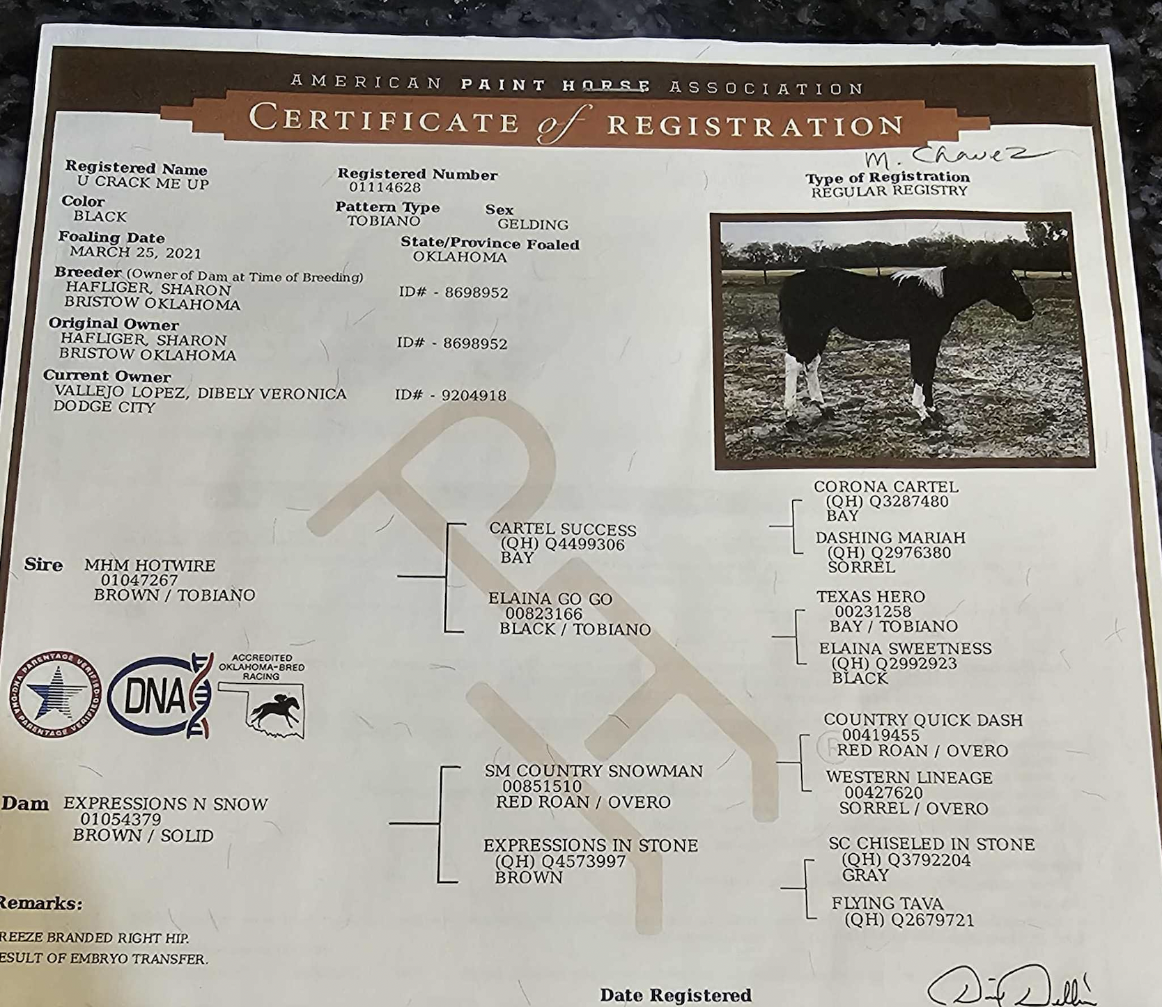 U Crack Me Up is a 2021 APHA black tobiano gelding son of MHM Hotwire (PE $690k+) by the great Cartel Success (LTE $181k+ by Corona Cartel). His dam, Expressions N Snow, won over $100,000 on the track herself, a daughter of the great Sm Country Snowman (LTE $269k+). This guy truly is by the greatest, and out of a greatest APHA Racing has to offer. Standing a solid 15.3 hands and weighing every bit of 1,250 lbs, he’s stout, well-built, and absolutely eye-catching. “I am not a paint person” will still turn and say “well, if I liked a paint, it would be him”.  Perfectly painted, huge-bodied, and the kind that turns heads everywhere he goes.